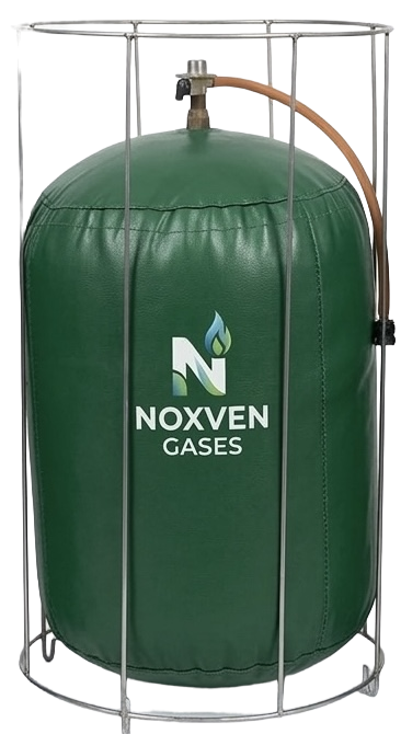 The Noxven Biogas Balloon is a 1000-litre flexible gas storage container filled with pure biogas, installed at your kitchen. It connects to your commercial burners like a standard LPG setup. When it runs out, we come and refill it on-site.